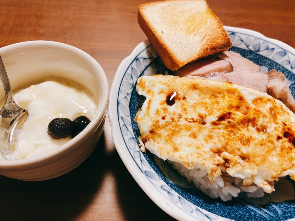 目玉焼き+チャーシュー丼、食パン、ヨーグルト