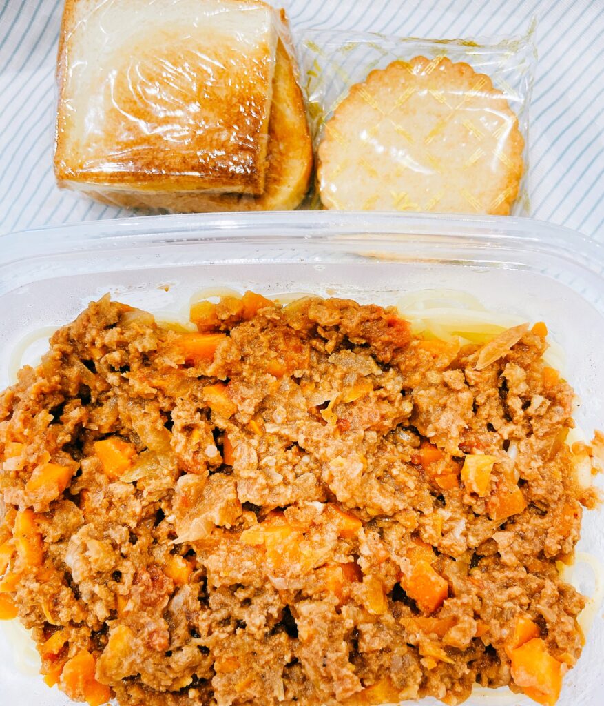 ミートスパゲティ、食パン こちらのミートも彼飯!!豚ミンチ、玉ねぎ、にんじんで✨