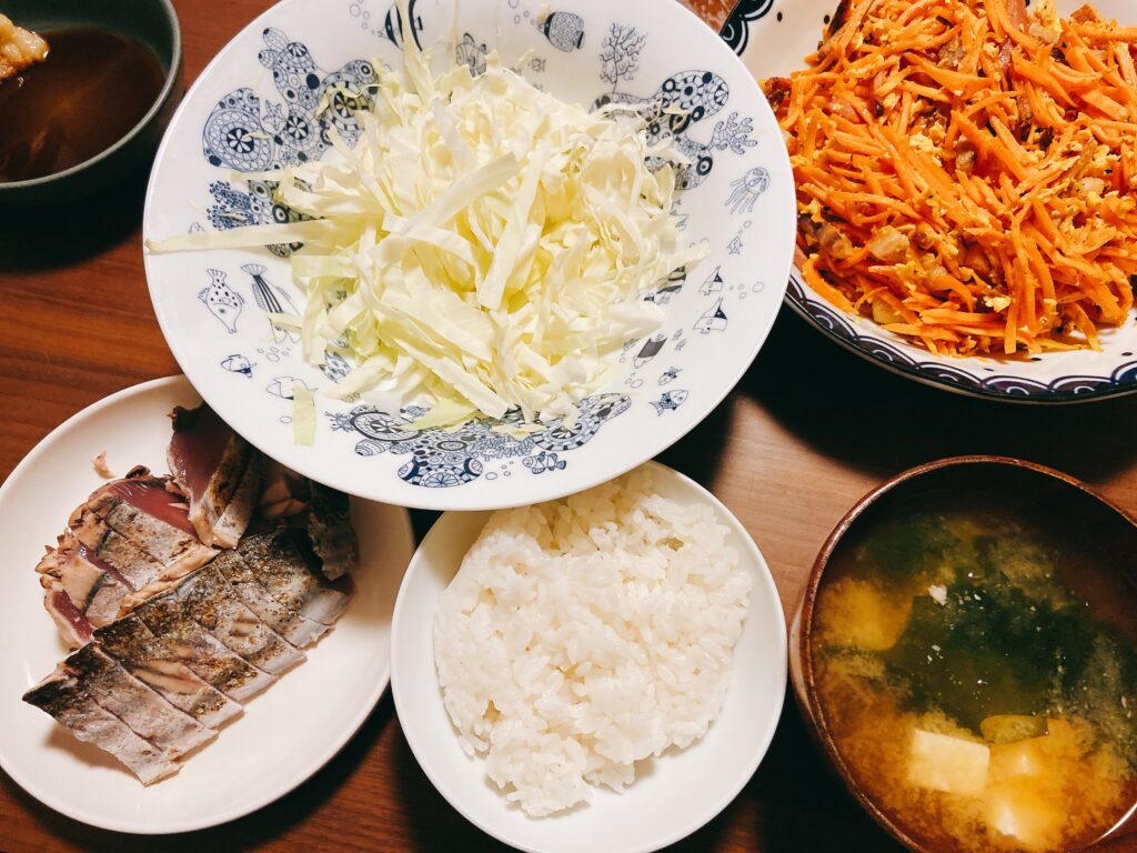 キャベツの千切り、彼飯にんじんシリシリ、かつおのたかき、味噌汁