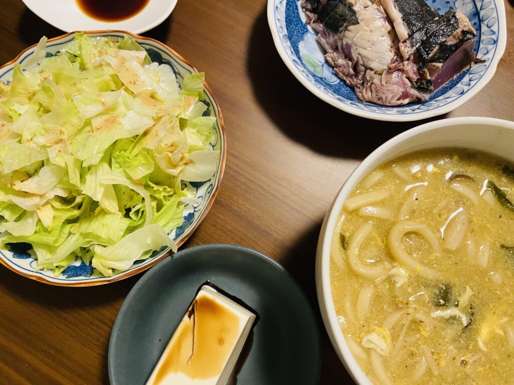 彼飯卵うどん、レタスサラダ、かつおたたき、奴!!